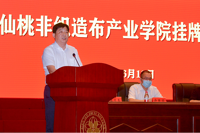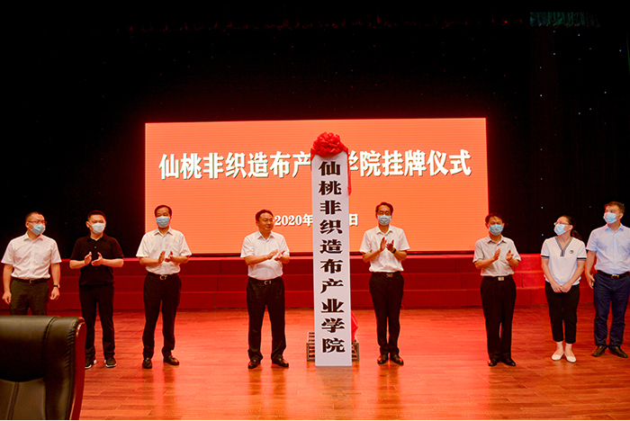 市长余珂和学院院长李立勇共同为仙桃非织造布产业学院揭牌