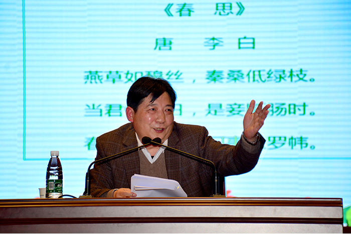 3月18日晚,文化艺术中心座无虚席、气氛热烈,党委书记郭百高以《诵读经典 绽放青春》为题,与1000余名师生一起赏鉴唐诗宋词,共同领略中国优秀传统文化的隽永魅力。