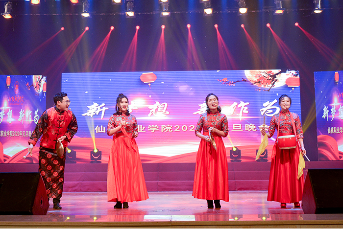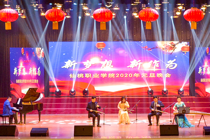 12月27日晚,文化艺术中心流光溢彩、笑语欢歌,“新梦想 新作为”元旦晚会在此盛大上演。市财政局局长黄文兵、市卫建委主任杜伟华、市广播电视台台长陈行军、市妇联主席熊云、市扶贫办主任陈学军、武汉新港汉江集装箱股份有限公司总经理梁华忠、学院党委书记郭百高、院长李立勇与1000余名师生一同观看演出、共迎佳节。