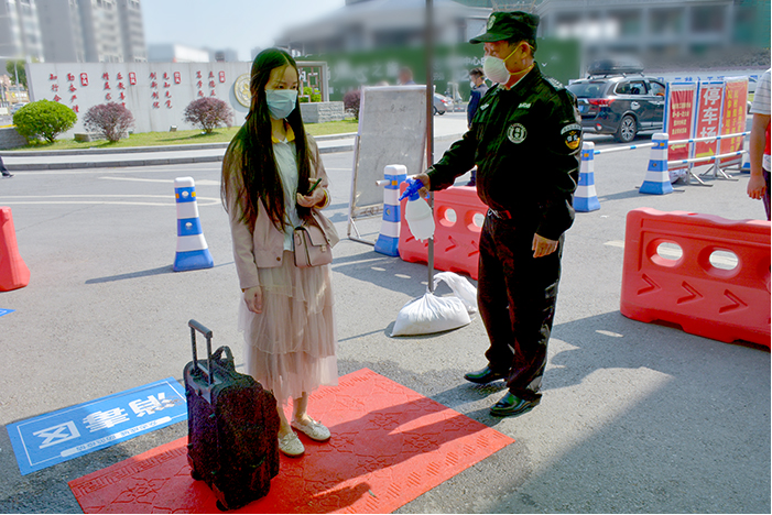 在学生公寓,返校“学生”保持间距,依次向宿管员展示进入宿舍凭证,经核实身份并测温消毒后进入宿舍。宿管员发现“学生”有咳嗽、发热等异常情况后迅速报告,由专人送到医护点,经医护人员判定后,将学生送往定点医院。