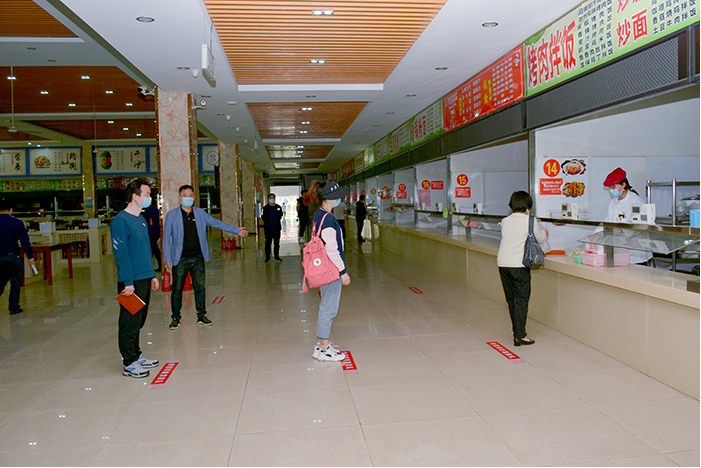 在学生食堂,“学生”洗手、脚部消毒、测体温后,依次从西门、北门进入,间隔1米距离排队购买餐食,带好餐食或单人单桌单向进餐后,从东门离开。就餐后,餐桌由工作人员即时消毒。