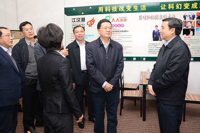 4月15日,副省长郭生练在我市调研,视察了我院大学生创业孵化基地、江汉潮创客空间。市委书记冯云乔、市长周文霞,市政协副主席、我院院长袁全汉等陪同。