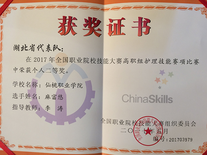 5月24日,2017年全国职业院校技能大赛高职组护理技能赛项圆满落幕。此次大赛由教育部主办,来自全国29个省市自治区的140名选手同场比拼,湖北省共派出6所高职院校参赛。经过激烈的角逐,我院护理专业学生麻富悠荣获二等奖,这也是我省高职院校在本次比赛中获得的最高奖项。