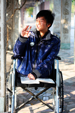 然而,当他用双臂支撑着身体“坐”在轮椅上,当他努力保持腰背挺直的姿势,当他时不时咧嘴一笑,露出细碎洁白的牙齿,当他在同学中间神采奕奕地谈论人生和理想,你会觉得,他根本不像是一名残疾人,一名失去双腿、生活无法自理的残疾人。他的阳光,他的开朗,甚至他的幽默,都会无形之中感染身边许多人。